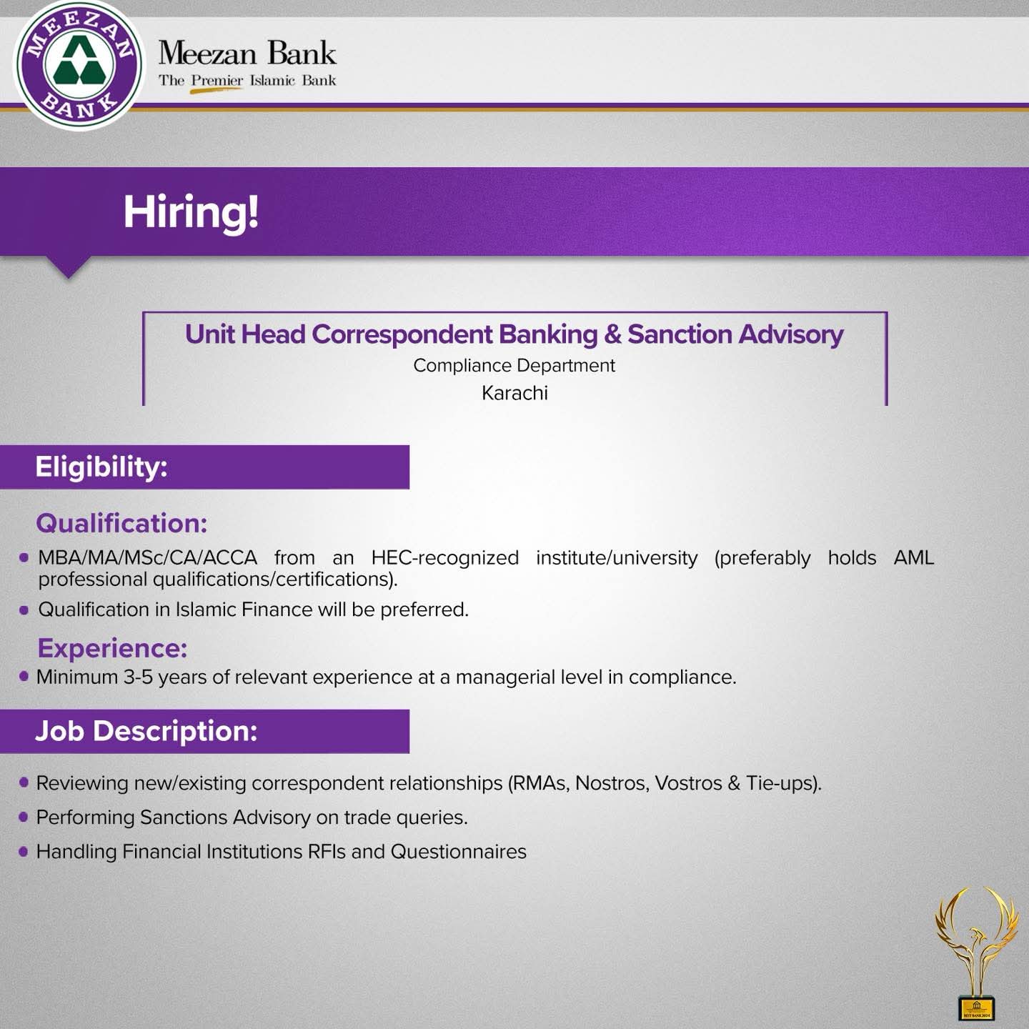 Tagged as: Bank jobs in Karachi 2025, Compliance jobs in Pakistan 2025, Compliance leadership jobs in banking, Correspondent banking compliance jobs, Eligibility for Unit Head Compliance at Meezan Bank, Government jobs 2025, Government jobs in Karachi, Government jobs in Sindh 2025, Govt jobs 2025, How to apply for Meezan Bank Unit Head jobs in Karachi, Islamic bank jobs in Karachi, Islamic banking jobs in Karachi 2025, Jobs in Karachi 2025, Jobs near me in Karachi bank sector, Karachi Bank Jobs 2025, Karachi bank jobs for experienced professionals 2025, Karachi jobs 2025, Karachi jobs for bankers, Meezan Bank career opportunities in compliance 2025, Meezan Bank Careers 2025, Meezan Bank Compliance Department openings 2025, Meezan Bank Compliance Jobs, Meezan Bank Head Office Jobs, Meezan Bank hiring 2025, Meezan Bank job application online, Meezan Bank Jobs 2025, Meezan Bank Karachi Jobs 2025, Meezan Bank latest vacancies 2025, Meezan Bank Unit Head Jobs 2025, new govt jobs 2025, Unit Head Compliance Meezan Bank, Unit Head job vacancies at Meezan Bank